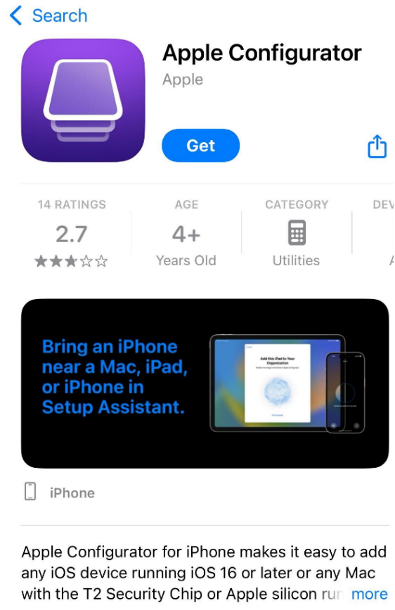 - The Apple Configurator app (available in the Apple App Store) installed on the helper iOS device(iphone/ipad).