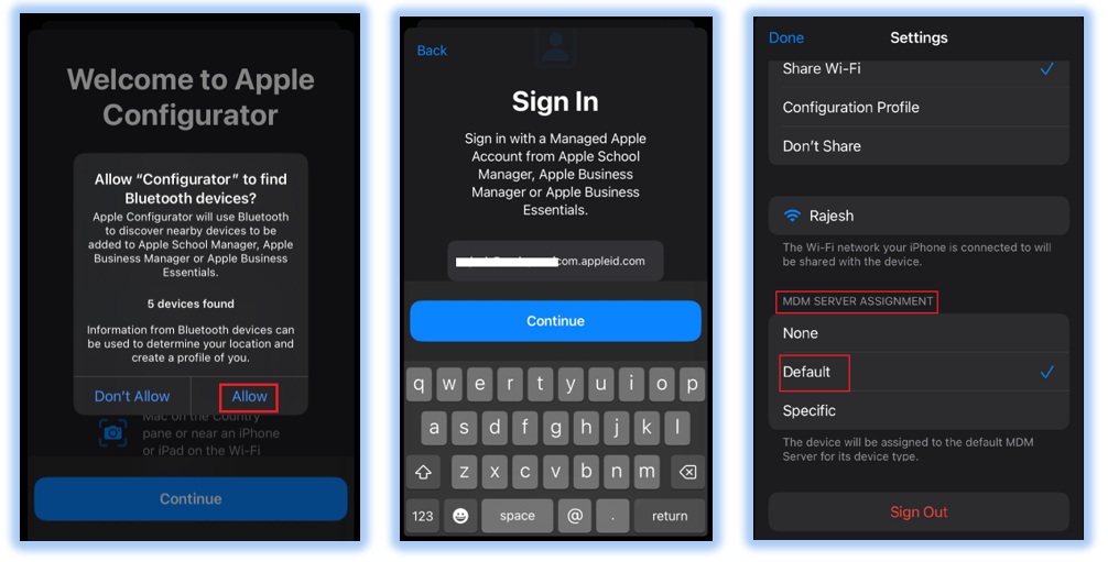 - Go to app settings then select “Default” option under “MDM Server Assignment” and choose “Share Wi-Fi” then click on Done.